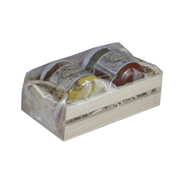 Un detalle delicioso y original en una práctica cajita de madera. Conservas artesanas y naturales, con las mejores materias primas frescas. Hechas con esmero por Amparo en su pequeño obrador.