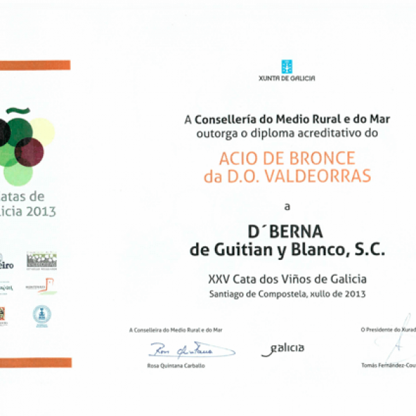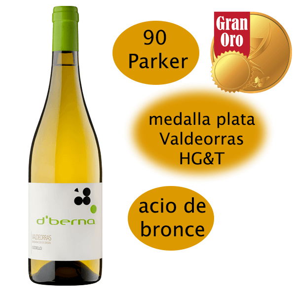 D'BERNA GODELLO 2016, un vino con multitud de premios, entre ellos al mejor vino blanco de los vinos D.O. Valdeorras, en la feria de 2016 del Barco de Valdeorras. Este galardón le ha sido concedido varias veces. Lo que demuestra su enorme calidad. Hay que tener en cuenta que la D.O. Valdeorras cuenta con algunos de los mejores vinos blancos de España. Nuestro consejo es que te olvides de sus premios y lo disfrutes.