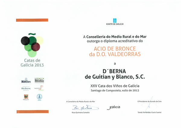 2015 Medalla de Oro Premio Galician wines. Estos galardones se otorgan a vinos embotellados a disposición de los consumidores. Se evita así una práctica habitual de las bodegas de presentar a concurso vinos diferentes a los que pueden disfrutar los consumidores.