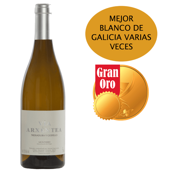 -Una botella de Vía Arxentea 2018 (DO Monterrei). De uva Godello y treixadura. Varias veces galardonado como mejor blanco de Galicia. Incontables premios.