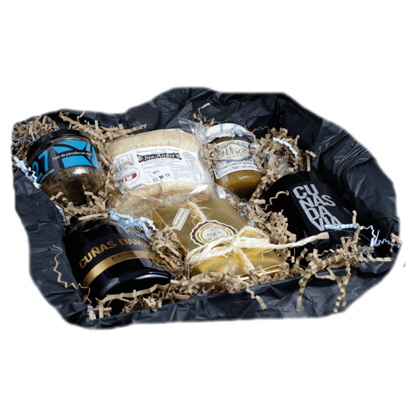 Dos vinazos, paté de percebes con algas; mermelada artesanal deliciosa; Rochas de chocolate para chuparse los dedos y El mejor queso de España (Sto André Curado) forman un regalo sublime.
