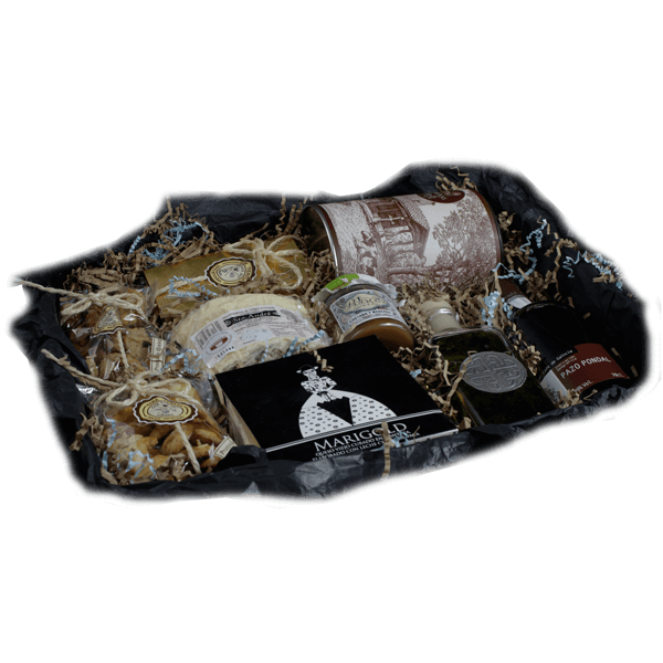 Este regalo está compuesto por dos licores, pastas, galletas y mermelada de castaña y manzana. Dos de los mejores quesos del mundo completan este regalo.