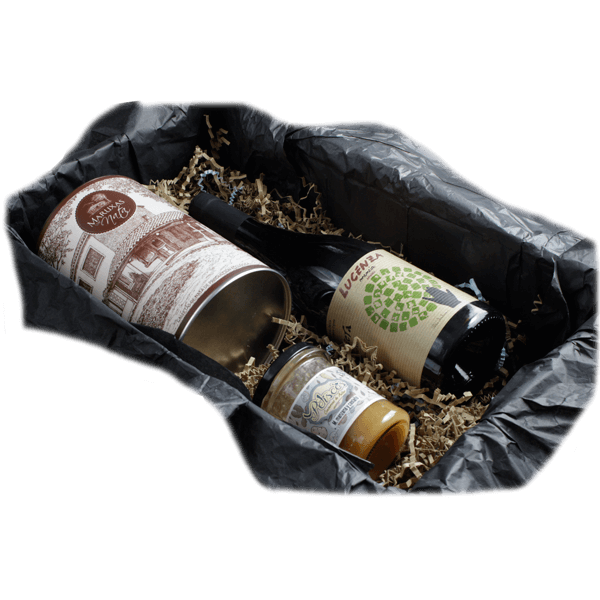 Una mermelada artesana y natural, sin espesantes ni conservantes: de manzana y castaña. Una botella del exclusivo vino Lucenza, un reconocido Mencía de la zona de Amandi (Ribeira Sacra). Todo ello armonizado con una caja de Maruxas de Nata, galletas de nata ecológicas, de reconocido prestigio y muy premiadas.