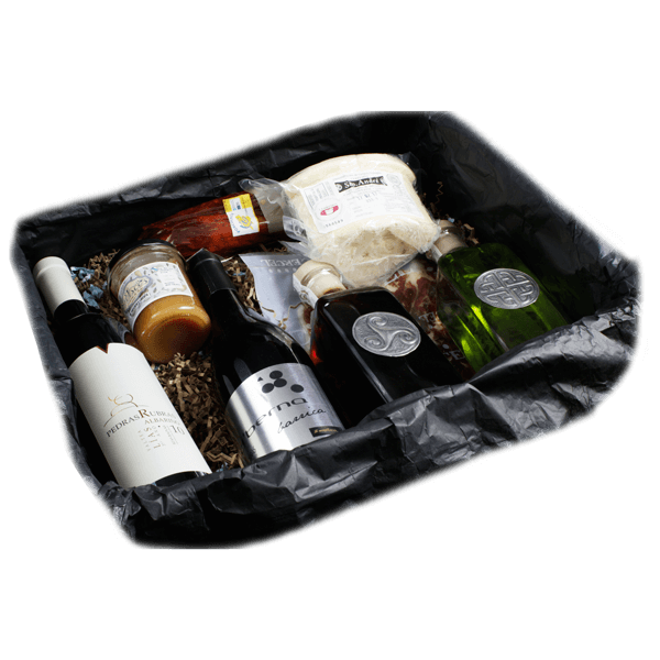 Dos grandes vinos para regar unos manjares selectos. Incluye mermelada de castañas y manzana artesanal, lomo y jamón del mejor Porco Celta de Campo; dos licores de orujo de producción limitada y elaboración con receta ancestral; una cuña del ganador absoluto del concurso de los quesos Gourmet curados de España.