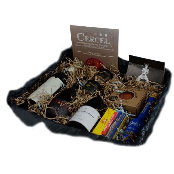 Tres vinos increíbles, el mejor jamón de porco celta que existe; patés y conservas de mar; dos quesos de renombre y una botella azul de aceite virgen extra completan este regalo lleno de sabor.