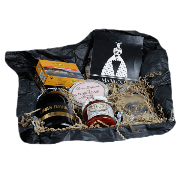 Un regalo elegante es el que auna uno de los mejores vinos del momento en una botella única, un licor de crema de orujo y mermelada artesanales sensacionales; navajas al natural exclusivas; zamburiñas selectas y una cuña de queso con multitud de premios.