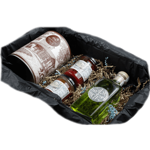 Una botella de licor de orujo y hoja de higuera. Dos mermeladas artesanales, sin conservantes ni espesantes: Mermelada pimiento y mermelada de tres cítricos. Completado con una caja de Maruxas de Nata, galletas de nata ecológicas, de reconocido prestigio.