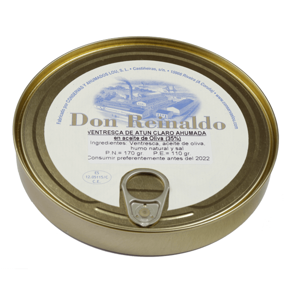 -Una lata de Ventresca ahumada de atún claro en aceite de oliva. Artesanal. Don Reinaldo.