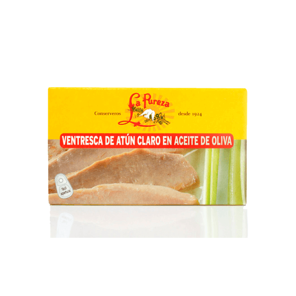 Una lata de ventresca de atún claro artesanal en aceite de oliva. La Pureza