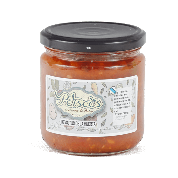 Esta conserva es la tradicional salsa que se hacía friendo los tomates de la huerta con otras verduras y hortalizas finamente troceadas, sin triturado final, pudiendo utilizarse en multitud de platos como guarnición o combinándola con pastas, arroces, carnes y pescados.