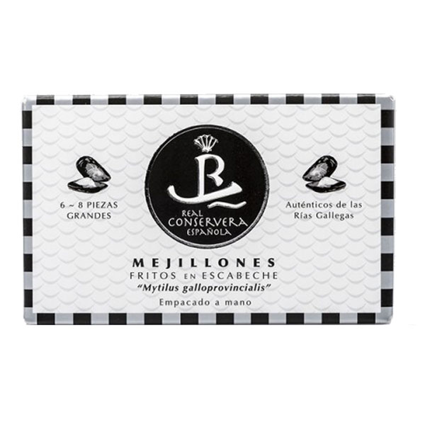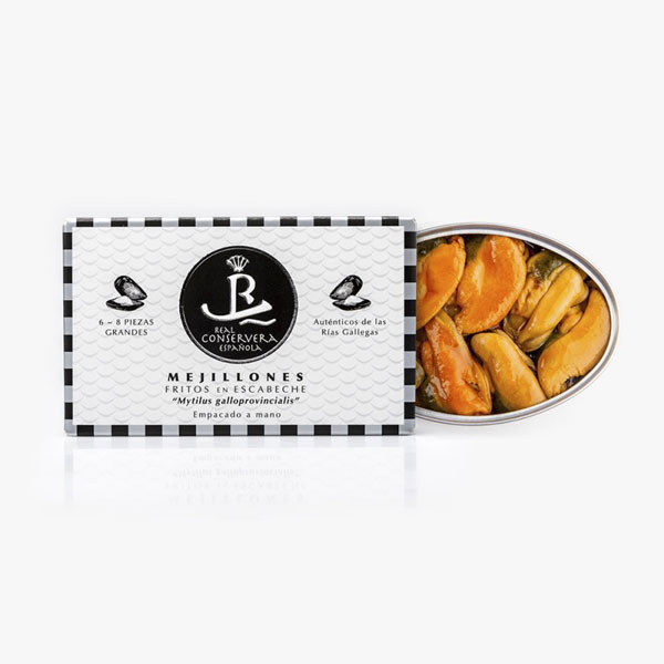 Mejillones cocidos, fritos en aceite de oliva y maridados con escabeche.