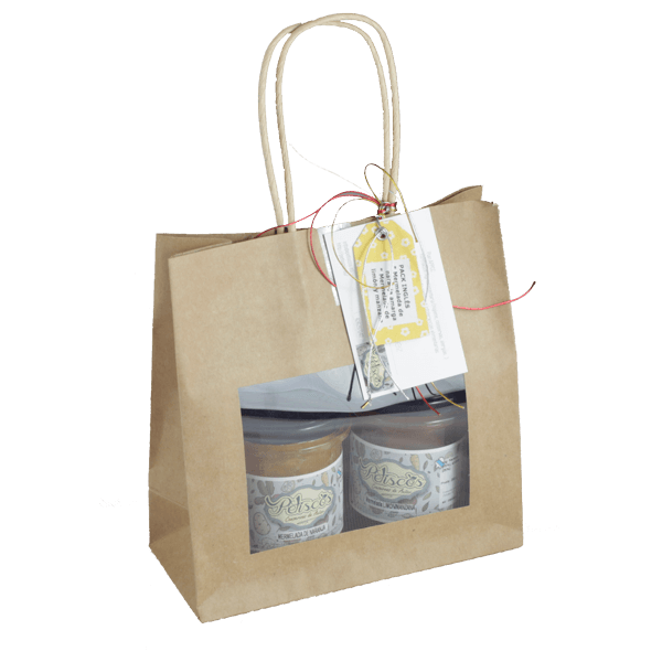 Dos mermeladas artesanas y naturales en una bolsita para regalo.