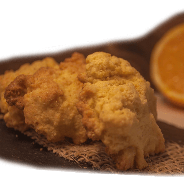 INGREDIENTES: Harina de maíz, manteca de vaca, azúcar, naranja confitada y huevos.